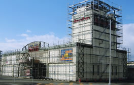 住宅足場、解体養生足場、吊り足場、看板塔足場、ローリングタワー、安全網板仮囲い、仮設トイレのレンタル