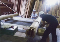 吹抜けの丸太を加工作業